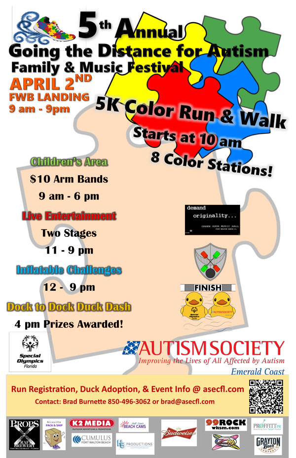 Name: 5th Annual ''Going the Distance for Autism'' Family & Music FestivalDate: April 2, 2016Time: 9:00 AM - 9:00 PM CDTLocation:The Landing 139 Brooks Street, SE, Fort Walton Beach, FL 32549Contact Information:Set a Reminder: -