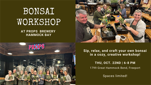 Name: Bonsai Workshop at Props Brewery Hammock BayDate: October 22, 2026Time: 6:00 PM - 8:00 PM CDTWebsite: http://zendenbonsai.com/