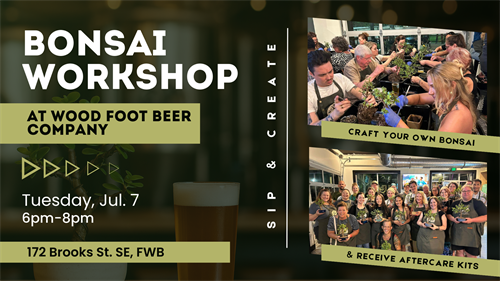 Name: Bonsai Workshop at Wood Foot Beer Co.Date: July 7, 2026Time: 6:00 PM - 8:00 PM CDTWebsite: http://zendenbonsai.com/