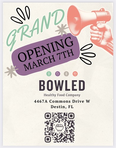 Event Description:Bowled Destin Grand Opening! First 100 customers receive $10 gift card! $7 bowls! Lots of door prizes!Location:4467A Commons Drive W