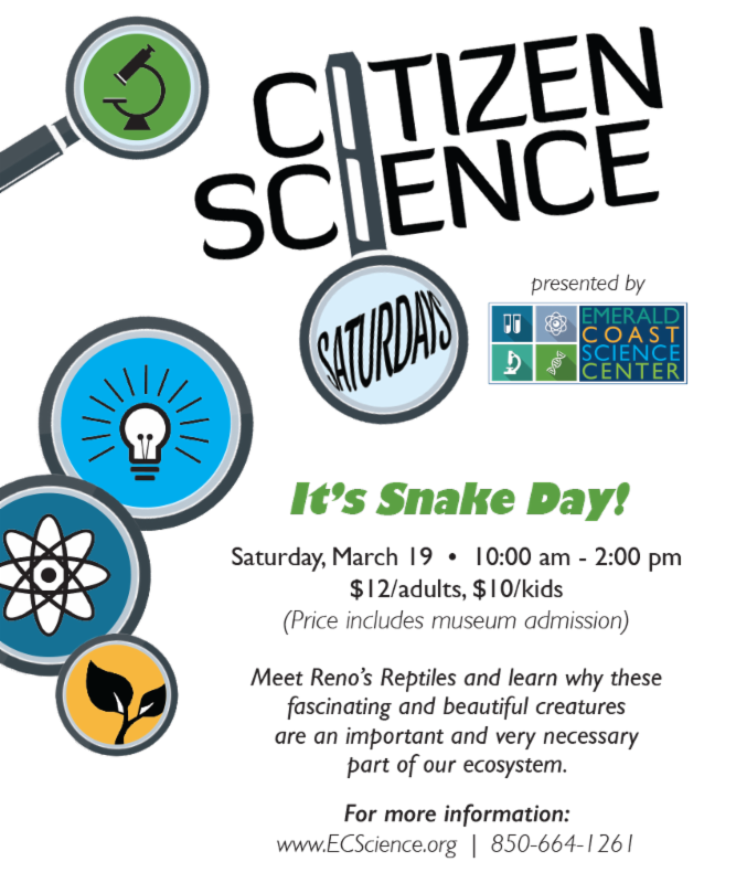 Name: Citizen Science Saturdays at Emerald Coast Science CenterDate: March 19, 2016Time: 10:00 AM - 2:00 PM CDTLocation:Emerald Coast Science Center 31 SW Memorial Pkwy, Fort Walton Beach, FL 32548Set a Reminder: -