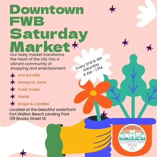 Step into a world where local charm meets outdoor delight at the Downtown Fort Walton Beach Saturday Market! Our lively market transforms the heart of the city into a vibrant haven, offering a kaleidoscope of handcrafted treasures, fresh produce, and the warm embrace of community spirit under the open sky. Join us as we celebrate local artisans, culinary wonders, and the joy of leisurely strolls through a marketplace brimming with coastal flair. The Downtown FWB Saturday Market is a rain or shine event on the 2nd and 4th Saturdays of the month, year round, from 8am-1pm. For vendor information please visit www.downtownfwb.com Located at the beautiful waterfront park downtown, Fort Walton Beach Landing Park 139 Brooks St SE, Fort Walton Beach, FL 32547