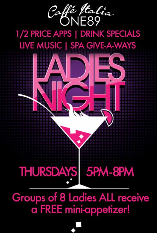 Name: Ladies Night at Caffe ItaliaDate: February 19, 2015Time: 5:00 PM - 8:00 PM CSTWebsite: http://www.caffeitaliaone89.comLocation:Caffe' Italia One89 189 Brooks Street SE, Fort Walton Beach, FL 32548Contact Information:Set a Reminder: -