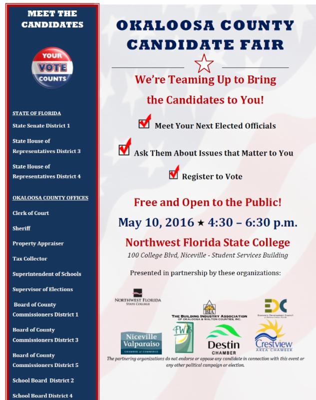Name: Okaloosa County Candidate FairDate: May 10, 2016Time: 4:30 PM - 6:30 PM CDTEvent Description: