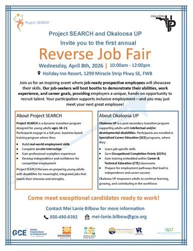 Reverse Job Fair FlyerEvent Description:Looking for motivated job seekers? Project Search and Okaloosa Up's First Annual Reverse Job Fair makes it effortless for employers. No table, no setup, no preparation required. Simply walk in, visit each intern's display, and ask the questions that matter. We've removed every barrier so you can focus on discovering real talent.Location:Holiday Inn Resort Fort Walton Beach by IHG