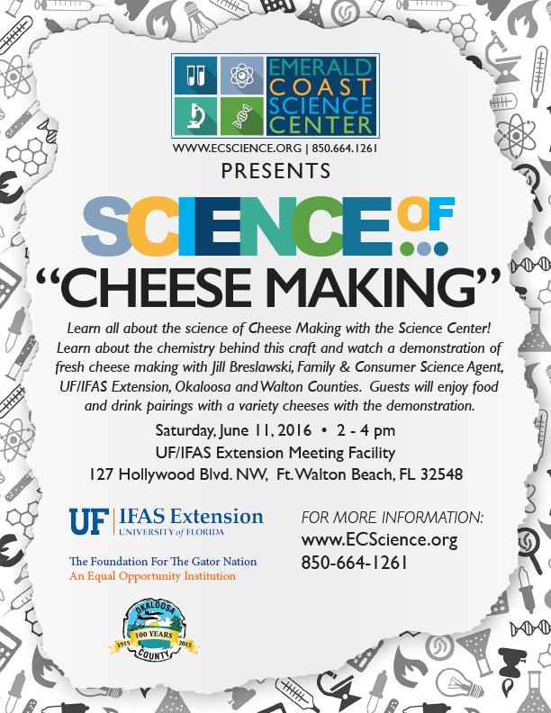 Name: The Science of Cheese Making (By EC Science Center)Date: June 11, 2016Time: 2:00 PM - 4:00 PM CDTLocation:UF/IFAS Extension Meeting Facility 127 Hollywood Blvd., NW, Fort Walton Beach, FL 32548Contact Information:Set a Reminder: -